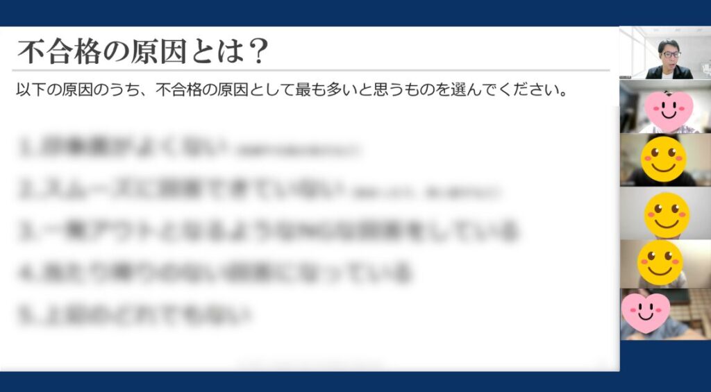自己流で対策していましたが、実際のNG例とOK例を比較しながら解説していただいたことで、どこが足りないかが明確になりました。具体例が多く、改善点が見つかりました。